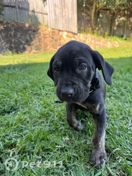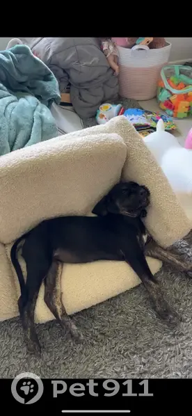 Val has a small white patch on her chest, small amount of brindle on paws and a little light smudge on her eyebrow. She was wearing a small, black collar with a zip tie to make it smaller to fit. Val is only 10 weeks old, and belongs to my 2year old daughter