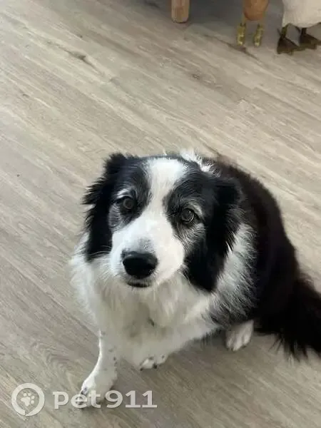 Bonnie is a black and white border collie with classic markings. She's wearing her collar which has her name and council registration on it. She is desexed and microchipped. She has black freckles on her white socks, and a few freckles on her snout. She has a white tip on her tail and white around her eyes.