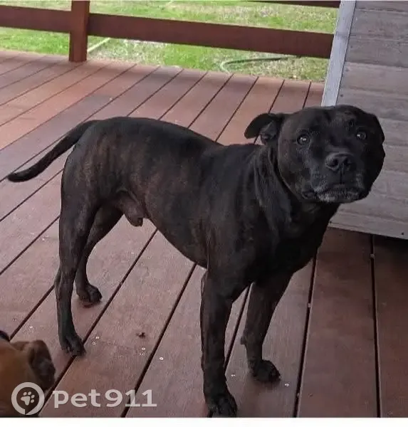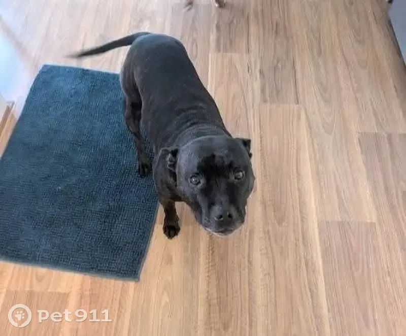 8 year old Black Brindle Staffordshire Bull Terrier with a grey beard. Wearing an orange collar with our phone number and his name. Someone opened our back gate and let him out. He is friendly but gets scared easily.