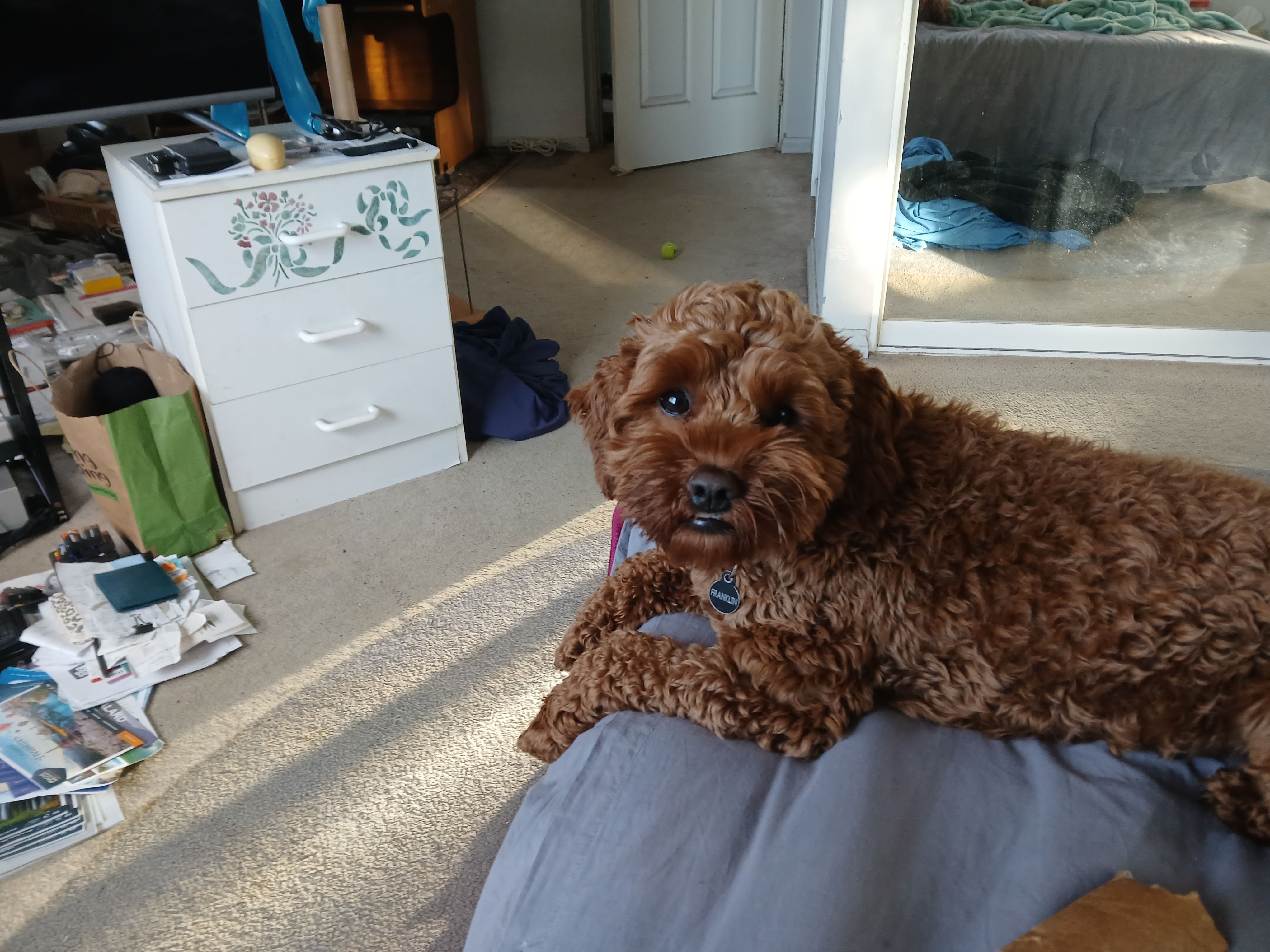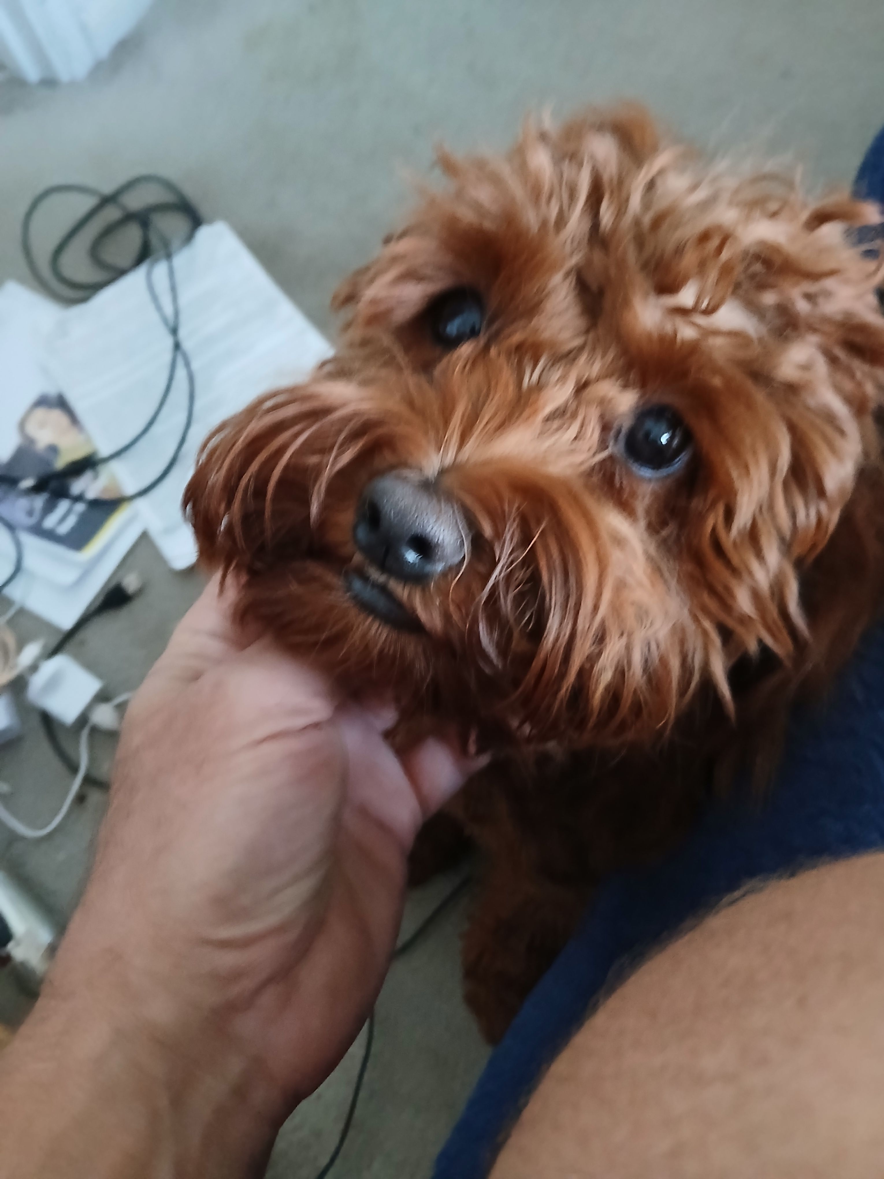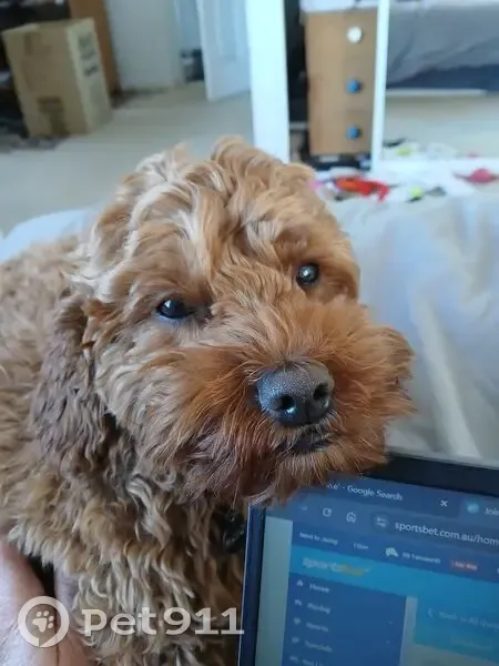 Escaped from open garage ... Franklin Cavoodle Medium length curly hair Rusty (light reddy brown) colour. Crooked incisor tooth on bottom jaw. Very friendly Distinct longer hair on end of tail. 1.5 years old Very friendly personality