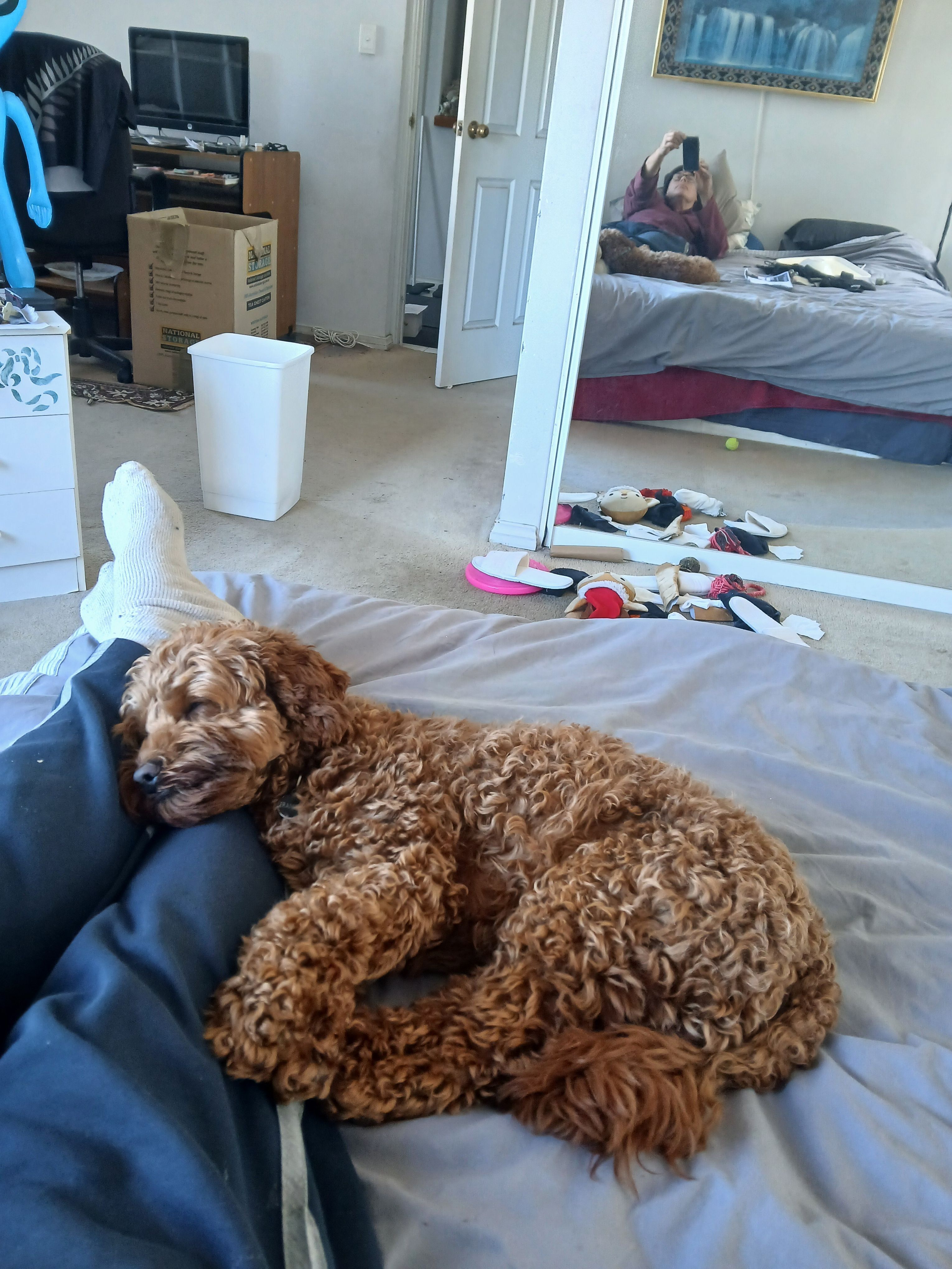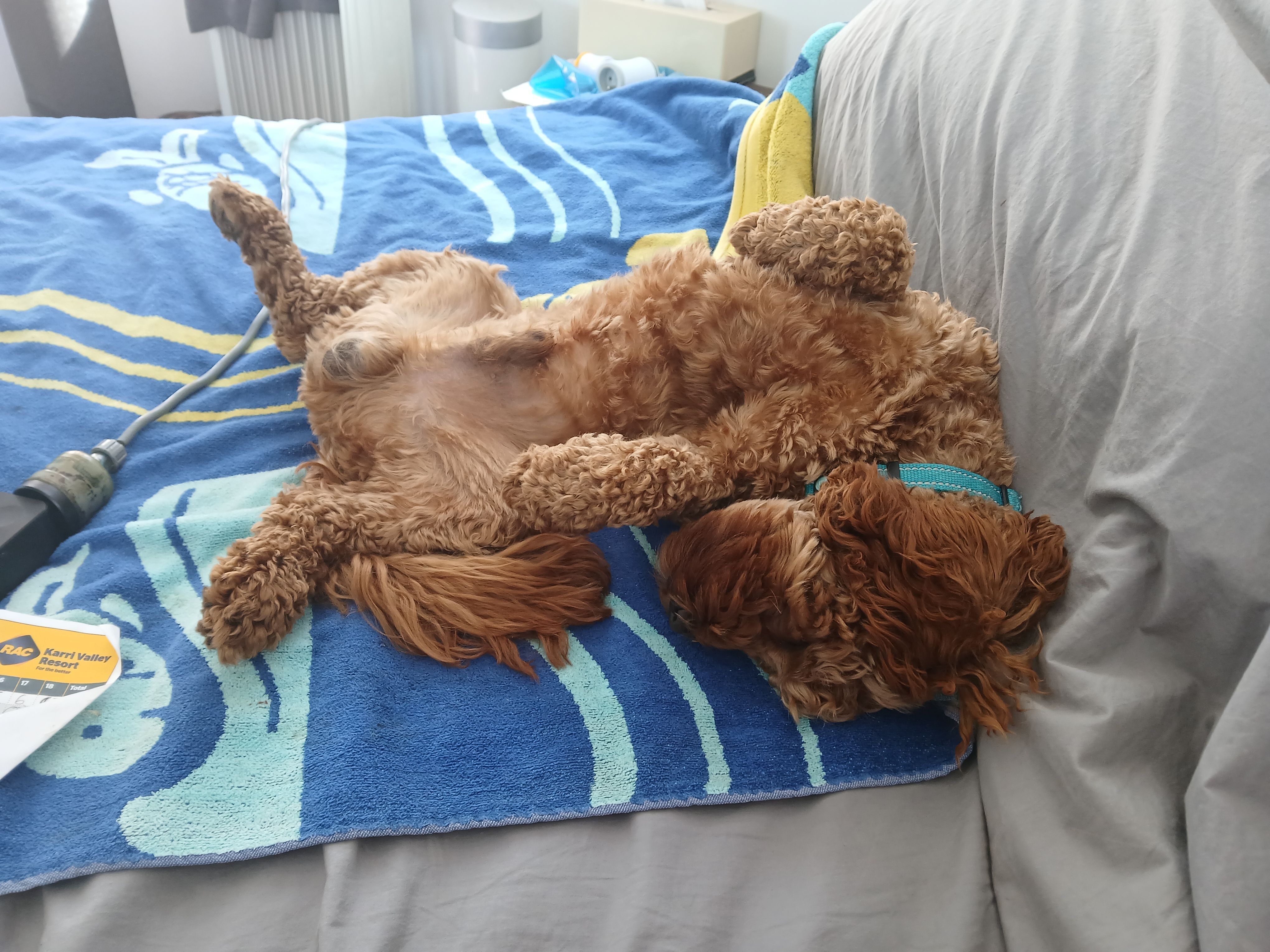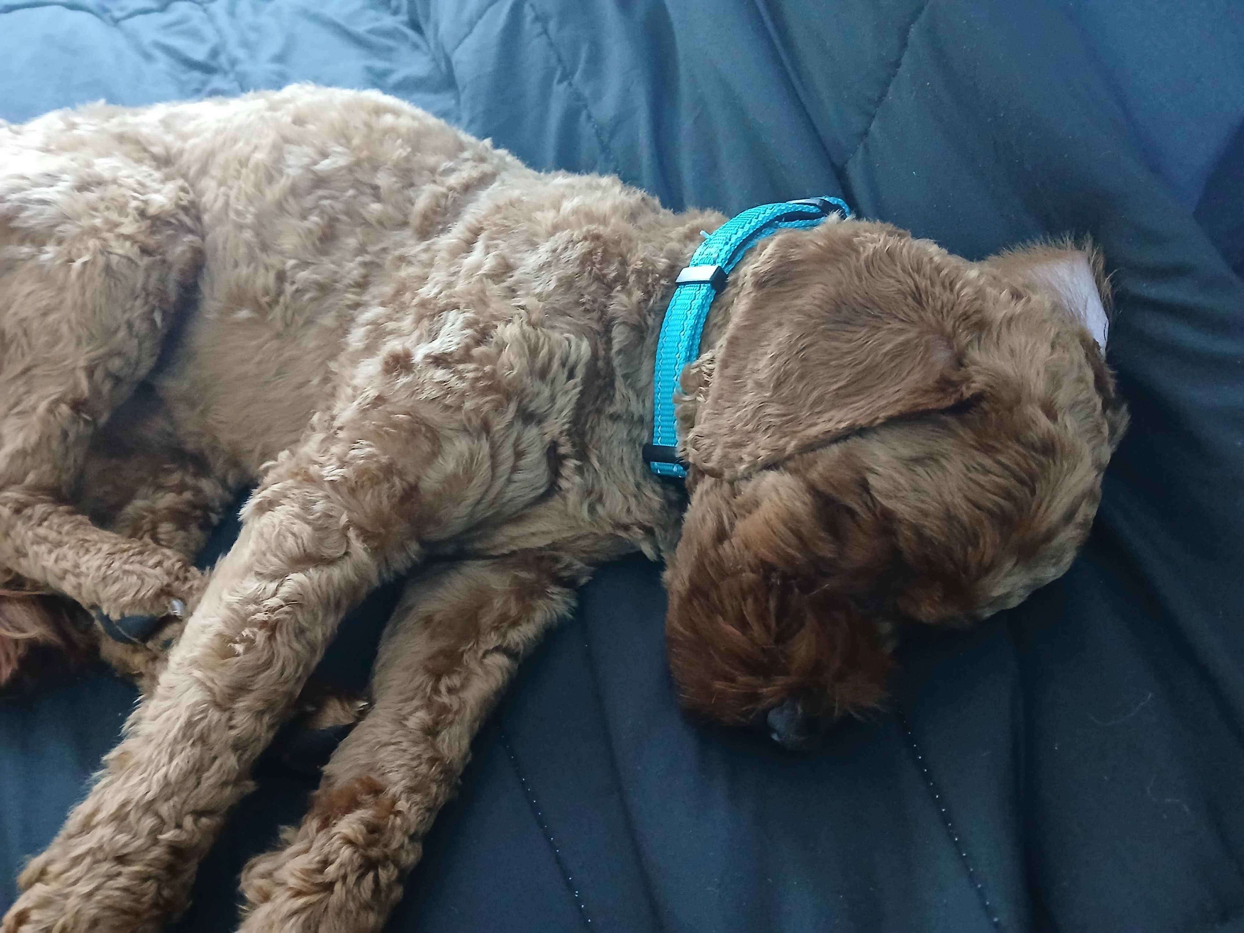 Escaped from open garage ... Franklin Cavoodle Medium length curly hair Rusty (light reddy brown) colour. Crooked incisor tooth on bottom jaw. Very friendly Distinct longer hair on end of tail. 1.5 years old Very friendly personality