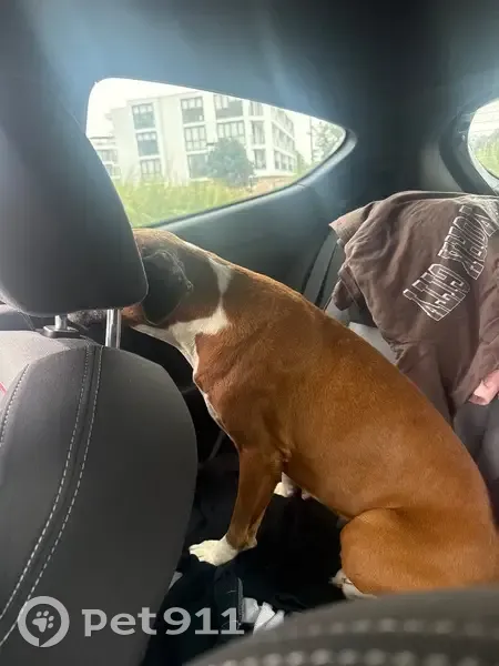 Medium-sized female dog, likely a boxer or boxer mix. Short brown coat with a white chest and white front legs. Distinct black and grey muzzle with a slightly greying face. Floppy ears and a stocky, muscular build. No collar or tag when found. She appears calm but a bit tired and unsure, friendly and not aggressive. Found wandering on Richmond Road near the IKEA/Marsden Park area.