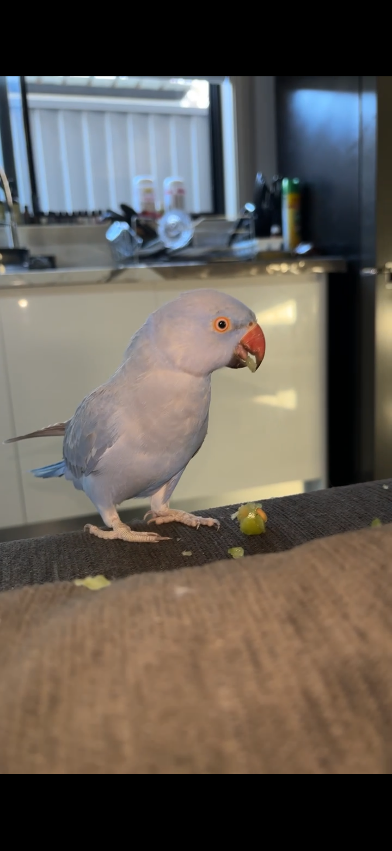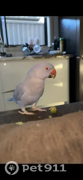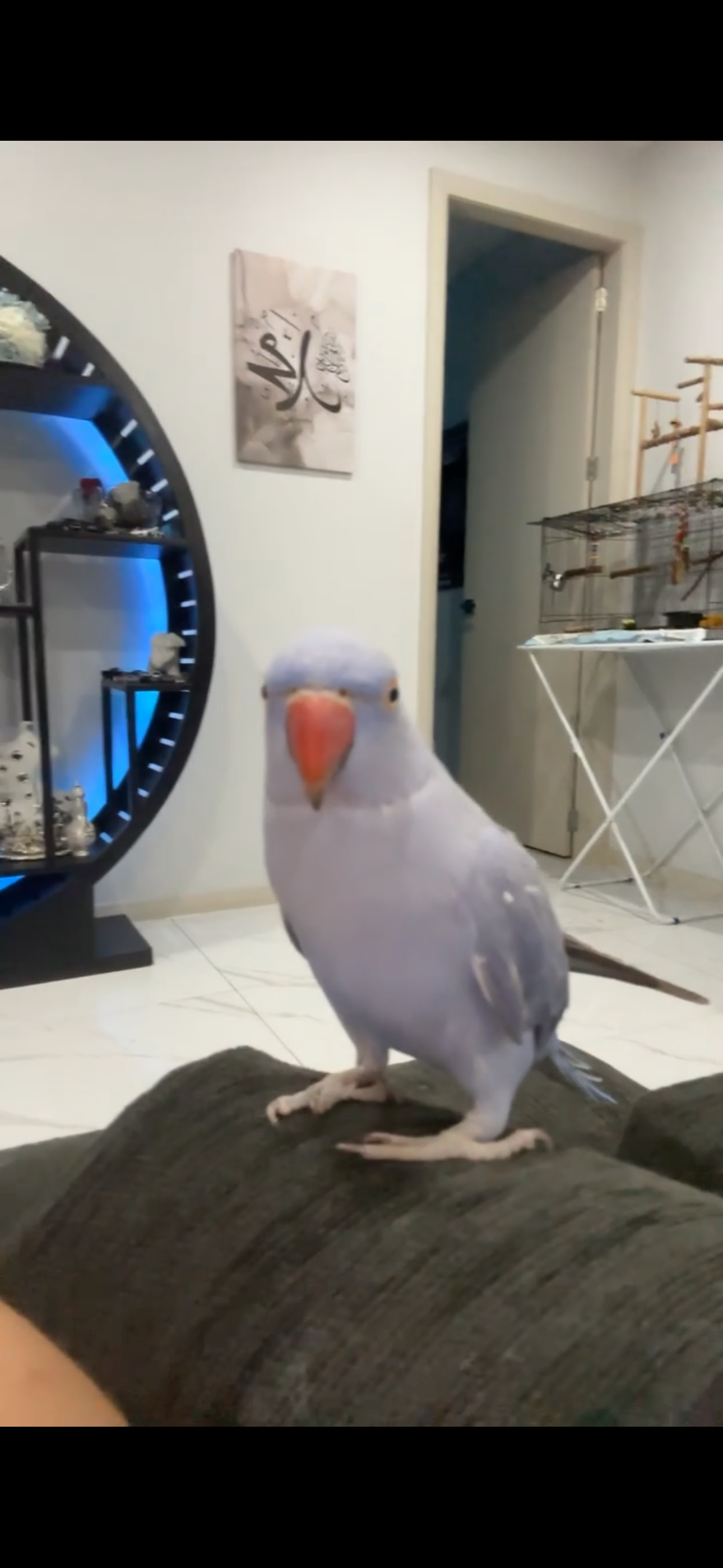 He is a blue indian ringneck parrot the lower part of he’s beak is black his ring is slowing starting to come in he’s wings are clipped but he can fly a certain height and he is very friendly his name is bubbles