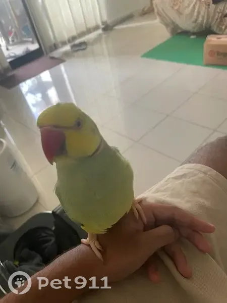 Green with a yellow head. Male. Just a year old with his ring finally coming in. Raised with walnuts as a treat. Hand raised and can step up, but doesn’t know any words
