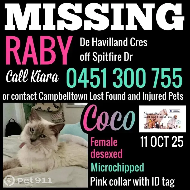Is very fluffy, mostly white with silver on her face and ears, paws and tail, pink collar with her name on it and my phone number 0451300755. Most likely escaped under a hole in the fence or jumped the fence into the neighbours yard.