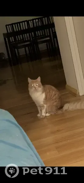 Description: • Color: Ginger (Orange) & White. • Coat: Long hair with a very fluffy tail. • Eyes: Amber/Honey color. • Distinctive: White chest and white paws.