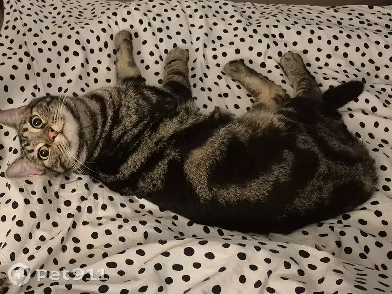 Male desexed tabby, with 'M' marking on his head. Pink nose with black outline, green eyes. He is super affectionate and very food motivated. He is microshipped.