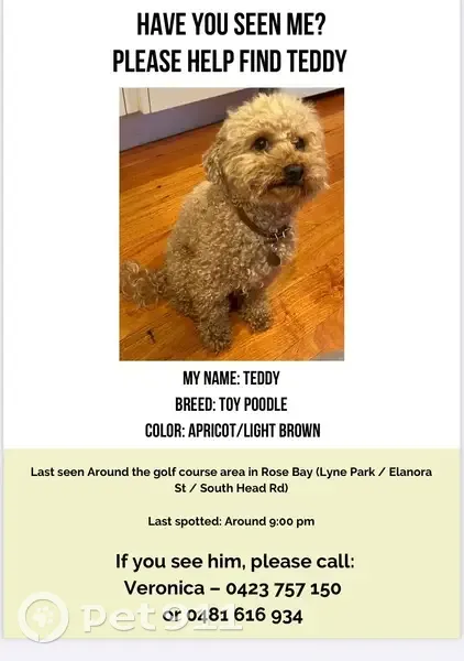 He left our place on 130 Luis Street in Bondi, ran towards his old place on 22 Liverpool Street in Rose Bay. Last seen on Newcastle Street in Rose Bay.