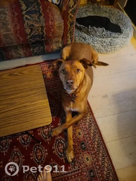 Kelpie mix - red dog. Wearing red collar. Super friendly & well trained.