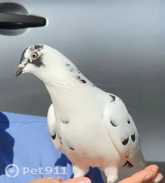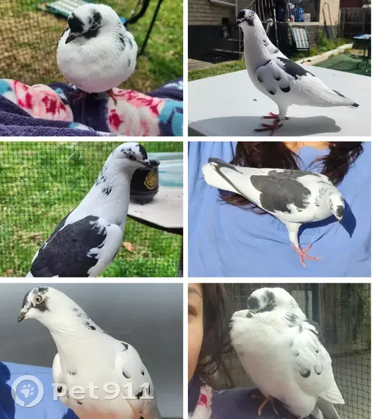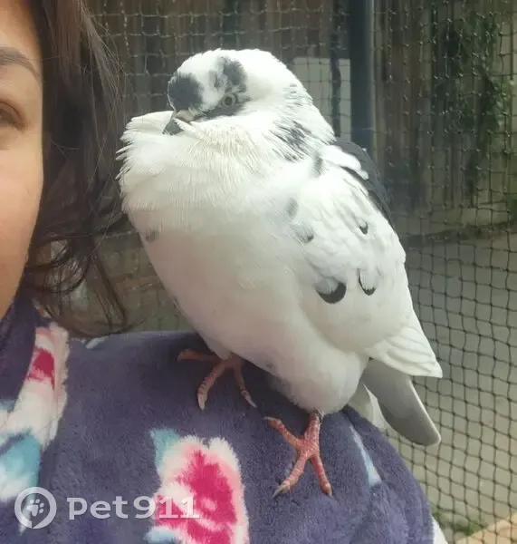 White pigeon with black spots on her face and wings. She didn't come home on Thursday 2nd Oct which is unusual because she has eggs and a partner. She loves spinach and will fly to you if you have some. She's very friendly to people and will easily come to you for company or food. Icky is only 6 months old but is fully grown.